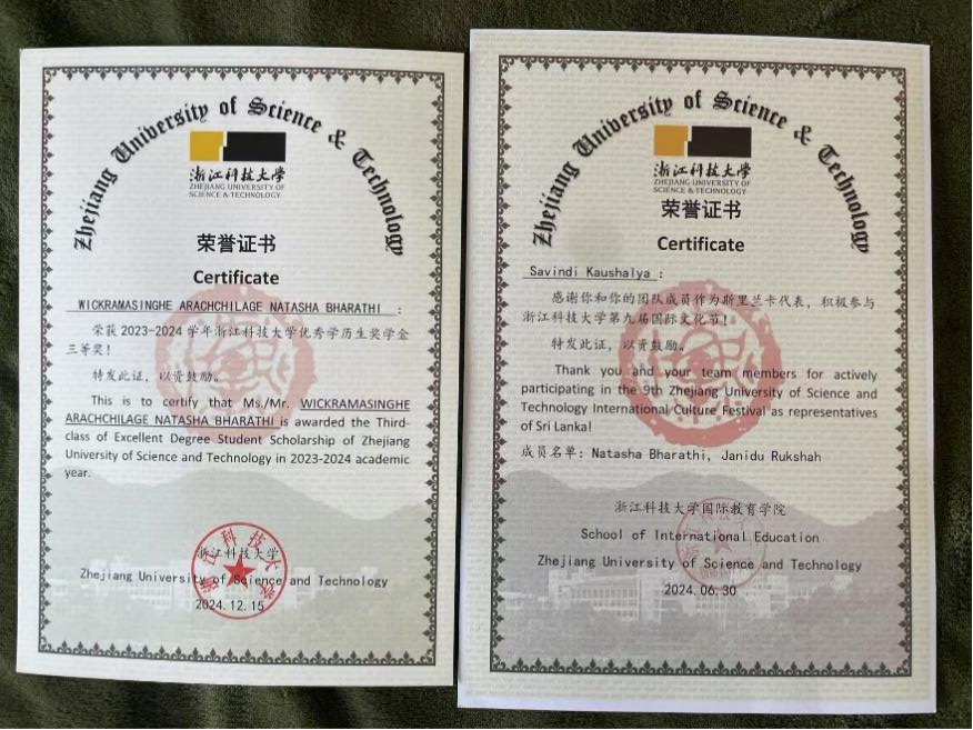 Throughout my four years at ZUST, I was honored to receive several scholarships and awards that motivated me to keep growing. In my first year, I was awarded the Second Prize Scholarship, followed by the Third Prize Scholarship in my second year. In my third year, I received the Zhejiang Provincial Government Scholarship, which was a meaningful recognition of my academic progress and dedication. In my final year, I was proud to receive the Third Prize Excellent Degree Scholarship.