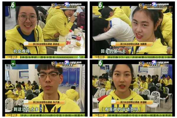 12月11-16日,第14届FINA世界游泳锦标赛(25米)在杭州举行,我校世游赛志愿者在岗服务期间,他们勇于担当、乐于奉献,用智慧和汗水践行了“奉献、友爱、互助、进步”的志愿者精神。服务期间,浙江民生休闲频道《1818黄金眼》节目对我校志愿者进行报道。
