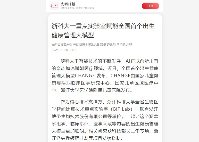 作为核心技术支撑方,浙江科技大学全省生物医学智能计算技术重点实验室(BIT Lab),联合浙江博圣生物技术股份有限公司等单位,一起让这个涵盖多组学、临床诊疗、医学文献等内容的出生健康管理大模型更加聪明。相关研究获科技部长三角专项、浙江省尖兵领雁计划等项目持续资助。