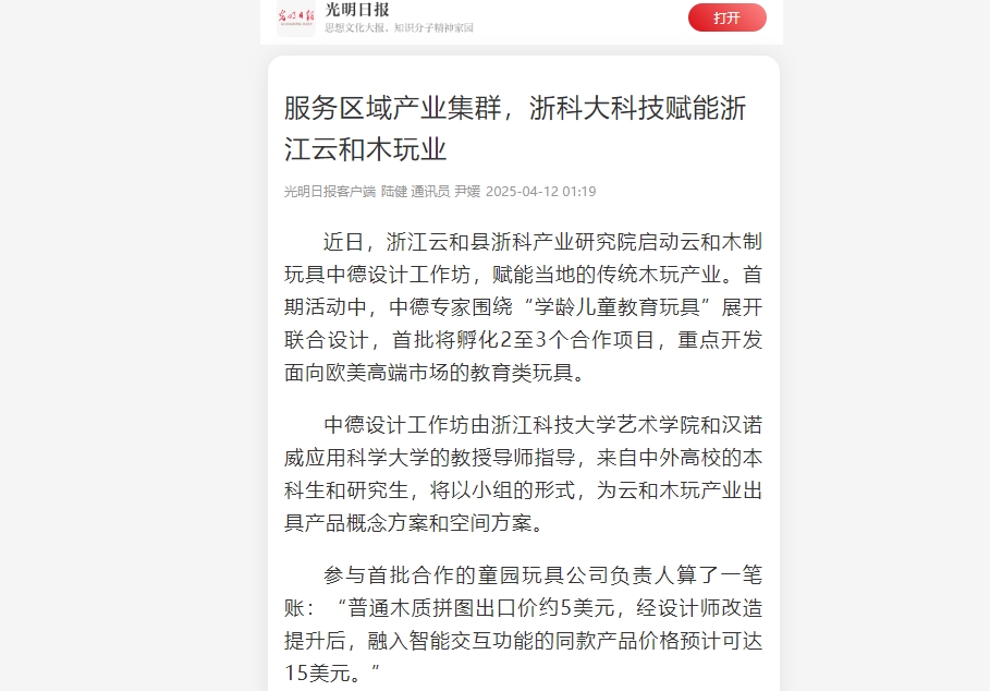 此次通过浙科大地方产业研究院,引入德国设计资源和浙江科技大学科研力量,就是要突破产业瓶颈,推动“云和制造”向“云和智造”转型。云和县相关负责人表示,“这不仅是产业升级的尝试,更是山区县实现共同富裕的创新实践。”