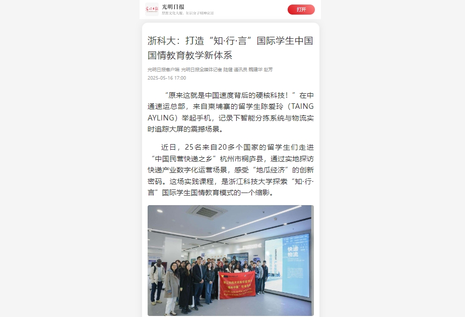 近日,25名来自20多个国家的留学生们走进“中国民营快递之乡”杭州市桐庐县,通过实地探访快递产业数字化运营场景,感受“地瓜经济”的创新密码。这场实践课程,是浙江科技大学探索“知·行·言”国际学生国情教育模式的一个缩影。