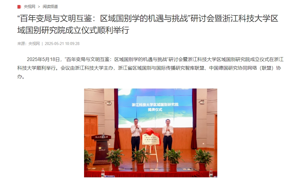 5月18日,“百年变局与文明互鉴:区域国别学的机遇与挑战”研讨会暨浙江科技大学区域国别研究院成立仪式在浙江科技大学举行。央视网、光明日报客户端等媒体对活动进行了报道。