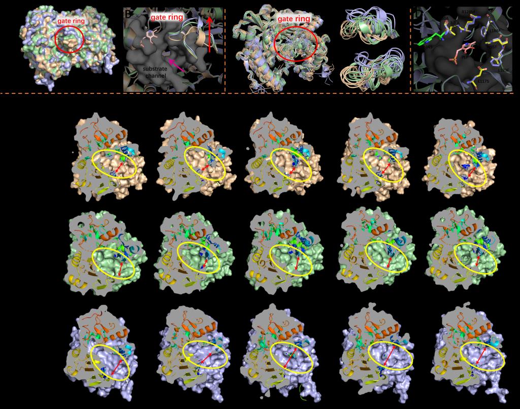 目前亟需开发具有更多高活性、高稳定性和广底物谱的转氨酶来适应工业生产的需要。本研究采用祖先序列重建-晶体结构导向-口袋工程(ASCP)策略,对土曲霉属来源的R-ω-ATA (AtATA)进行蛋白工程改造,以提高其热稳定性及对非天然底物的催化活性。通过祖先序列重建策略,获得了热稳定性显著提升的祖先酶Anc101,相比于AtATA,其半失活温度高了10.9oC,在45 oC的半衰期是AtATA的484倍。为提高Anc101对非天然底物的活性,通过解析Anc101的X射线晶体结构(PDB: 8ZM7),并以此结构为指导对底物结合口袋进行修饰。经过8轮迭代饱和突变,得到了对大体积底物3-乙酰联苯催化活性提高133倍的最佳突变体Anc1016 (Anc101-H55T-E117S-R128M-V150A-L183F-L188F)。与Anc101相比,Anc1016对14种非天然底物的转化率提高了2-87%。分子动力学结果表明,覆盖在Anc1016口袋入口的“门控环”比Anc101更灵活,从而增加了底物与结合口袋的接触;并且Anc1016的大底物结合口袋和小底物结合口袋的总体积也有所增加,这两种变化都有助于增强Anc1016对非天然底物的活性。