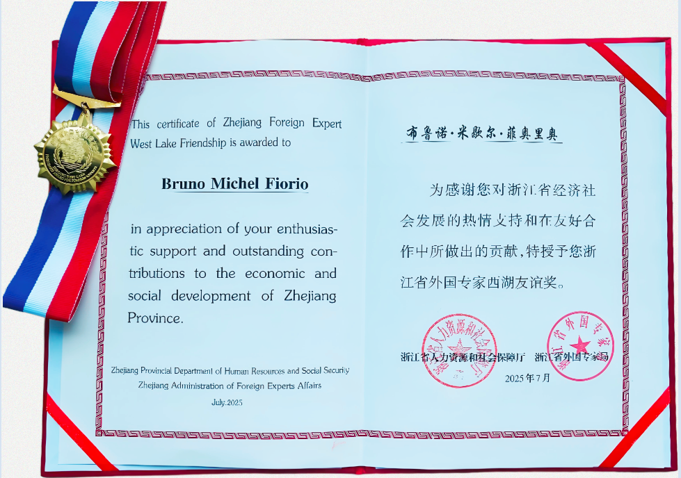 7月8日,2024年度浙江省外国专家“西湖友谊奖”颁奖仪式在浙江省人民大会堂隆重举行。我校中法土木工程合作办学项目负责人、法国塞吉巴黎大学副校长布鲁诺·米歇尔·菲奥里奥(Bruno Michel FIORIO)先生荣获该奖项。截至目前,我校累计共有11位外国专家获得“西湖友谊奖”。