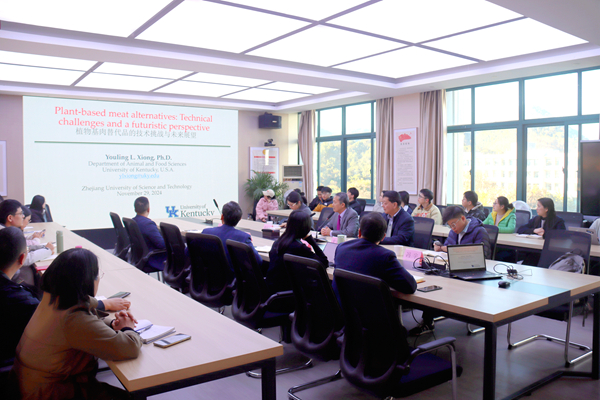 讲座中,熊幼翎教授结合自身科研经验,介绍了美国植物蛋白肉的研究现状及未来趋势,深入分析了植物肉的质构、风味、健康、营养和食品安全等方面的局限性,并与现场师生进行了深入研讨交流。