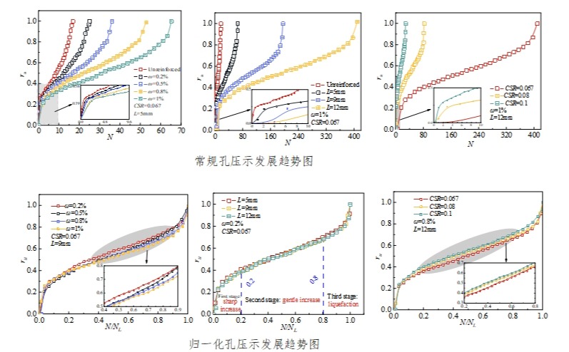 在《Acta Geotechnica》上发表的“Liquefaction behavior of fiber-reinforced calcareous sand under cyclic simple shear tests”(点击阅读),孔勃文博士为论文第一作者,硕士生何欢为第二作者,邹宝平教授为论文通讯作者,浙江科技大学为第一单位。该研究采用单向不排水循环单剪试验模拟地震荷载下钙质砂的水平剪切应力状态,该方法相比传统三轴试验更精确地反映地震时土层内部的剪切行为。研究系统分析了纤维掺量、纤维长度和循环应力比三个变量对纤维增强钙质砂的液化阻力、刚度退化及孔隙水压力发展的影响。基于试验数据,研究首次建立了一个孔隙水压力预测模型,综合考虑纤维掺量和循环应力比的影响,该模型能有效预测不同工程工况下纤维增强钙质砂的孔压演变规律。论文成果不仅深化了对纤维增强钙质砂动力行为的科学认识,成果可直接应用于我国海岛礁石填筑工程的抗震设计与灾害防控,具有重大的工程应用价值。
