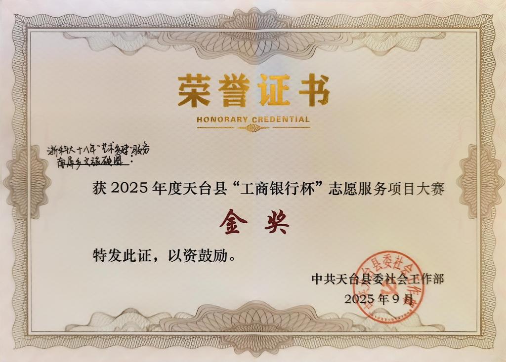近日,在天台县志愿服务大赛中,生化学院“行走青春·共富南屏”志愿服务项目从众多参赛项目中脱颖而出,获大赛金奖。