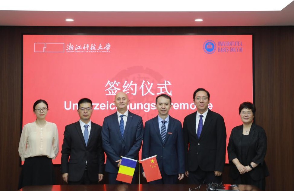 (10月17日,陈建孟、李其朋会见罗马尼亚克卢日巴比什-博雅依大学副校长,两校签署了浙江科技大学德语国家研究中心与克卢日巴比什-博雅依大学德语教学与研究院合作协议)