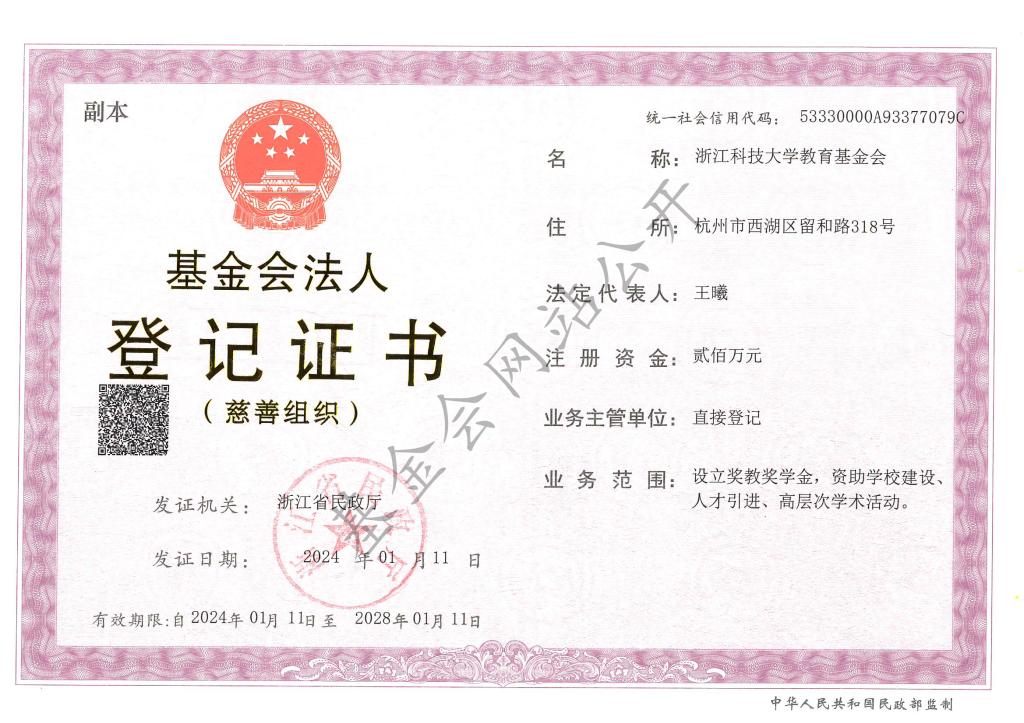 浙江科技大学教育基金会(简称基金会)于2014年3月在浙江省民政厅注册成立,性质为非公募基金会,基金会统一社会信用代码为53330000A93377079C。