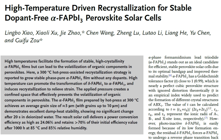 理学院应用物理系软物质与功能纳米材料研究团队在国际TOP学术期刊《Advanced Science》(IF=14.3,中科院一区TOP)期刊上发表了题为"High-Temperature Driven Recrystallization for Stable Dopant-Free α-FAPbI3 Perovskite Solar Cells"的研究论文。浙江科技大学为第一单位,理学院肖凌波博士为第一作者,苏州大学大赵杰教授、邹贵付教授为论文通讯作者。