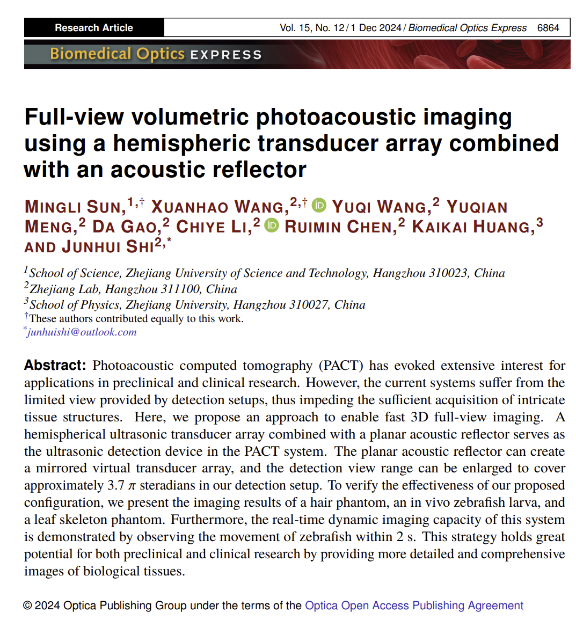 近日,理学院光子与光场调控研究团队在光声成像研究领域取得进展,相关研究成果以“Full-view volumetric photoacoustic imaging using a hemispheric transducer array combined with an acoustic reflector”为题,发表于光学领域期刊《Biomedical Optics Express》(影响因子2.9,中科院2区)。浙江科技大学为第一单位,理学院孙明丽为论文的第一作者,之江实验室施钧辉教授为论文的通讯作者。