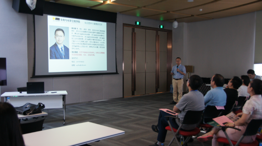 黄俊、吴元锋、韩小瑜分别介绍了生物与医药、食品营养与健康、功能材料与绿色化工过程等三个研究所教授、博士的学术研究专长和社会服务特长。