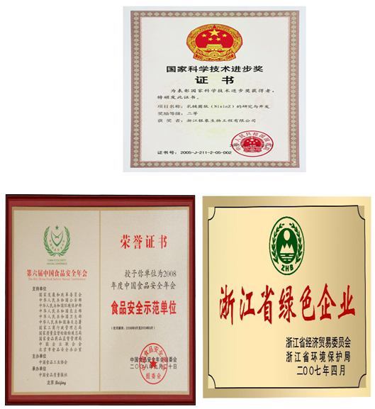 公司建有世界上率先利用植物蛋白制备乳酸链球菌素生产线,现有乳酸链球菌素年生产能力500吨,已成为世界上最大的乳酸链球菌素制造商。公司通过了ISO9001质量管理体系、ISO22000食品安全管理体系、ISO14000环境管理体系认证、浙江省清洁生产考核、浙江省“绿色企业”审核和浙江食品GMP达标企业考核。公司主导产品“银象牌”乳酸链球菌素在中国乃至全球都极具竞争力,质量符合中国QB2394-2007,欧盟E234、美国FCC IV等标准,取得了美国FDA注册和Kosher(犹太)认证、HALAL(清真)认证。公司、产品荣获了“2005年度国家科学技术进步奖二等奖”、“中国食品工业协会科技进步特等奖”等荣誉。